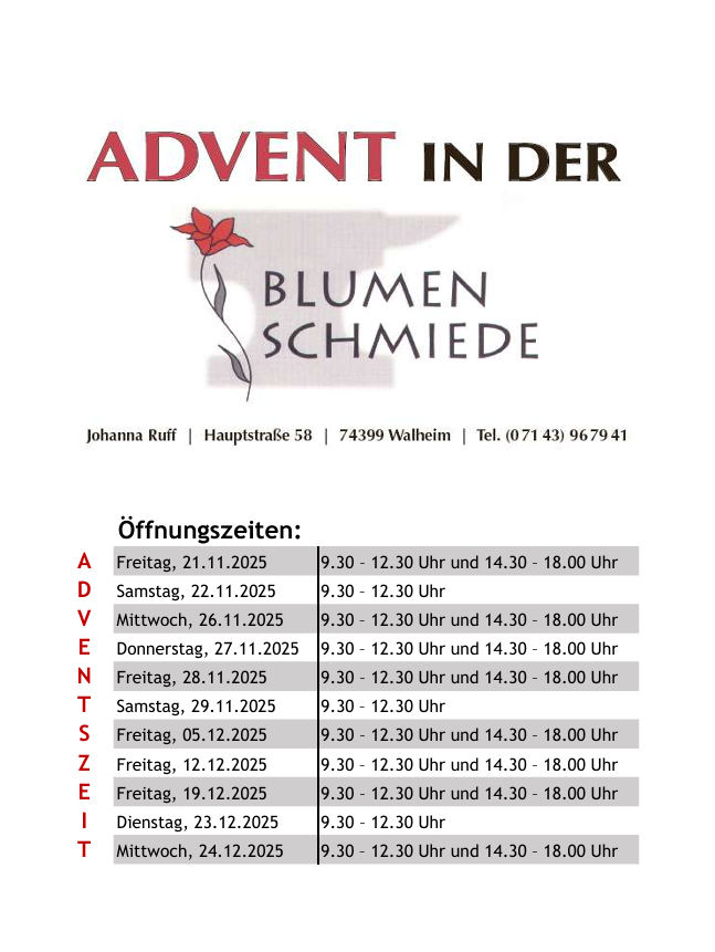 Öffnungszeiten: Freitags von 9.30 Uhr bis 12.30 Uhr
